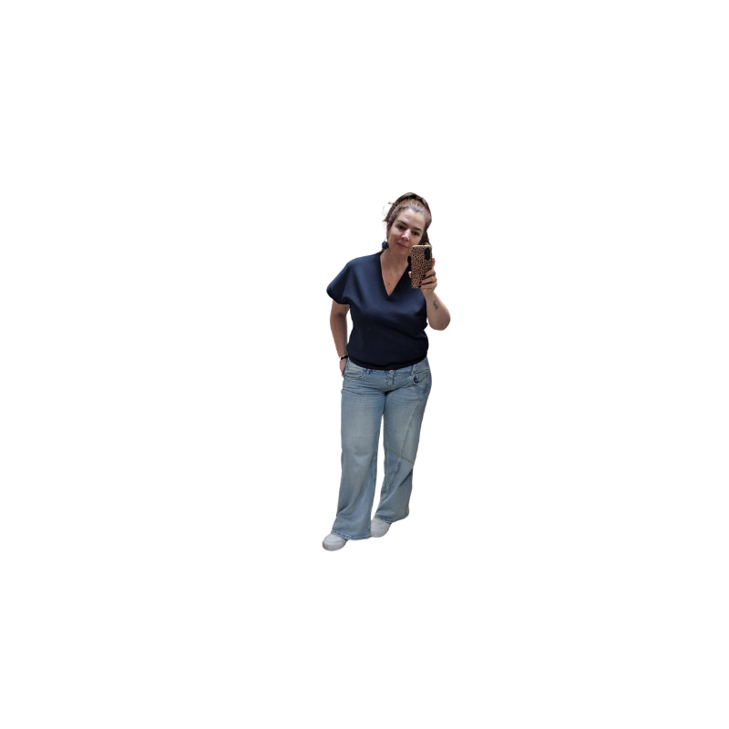 Scuba top met aangeknipte mouw en v-hals. Valt mooi op maat verbergt alle probleemplekjes.